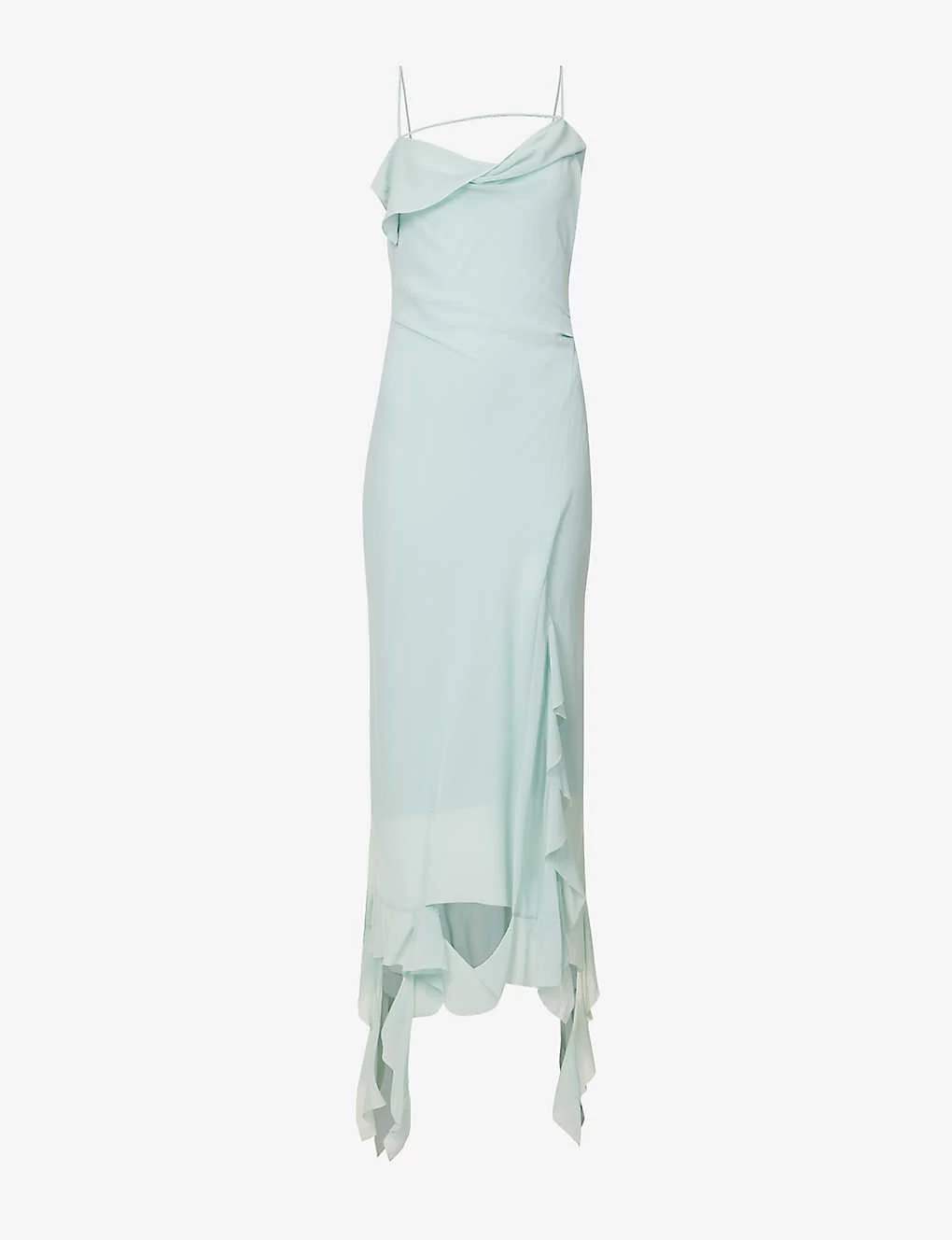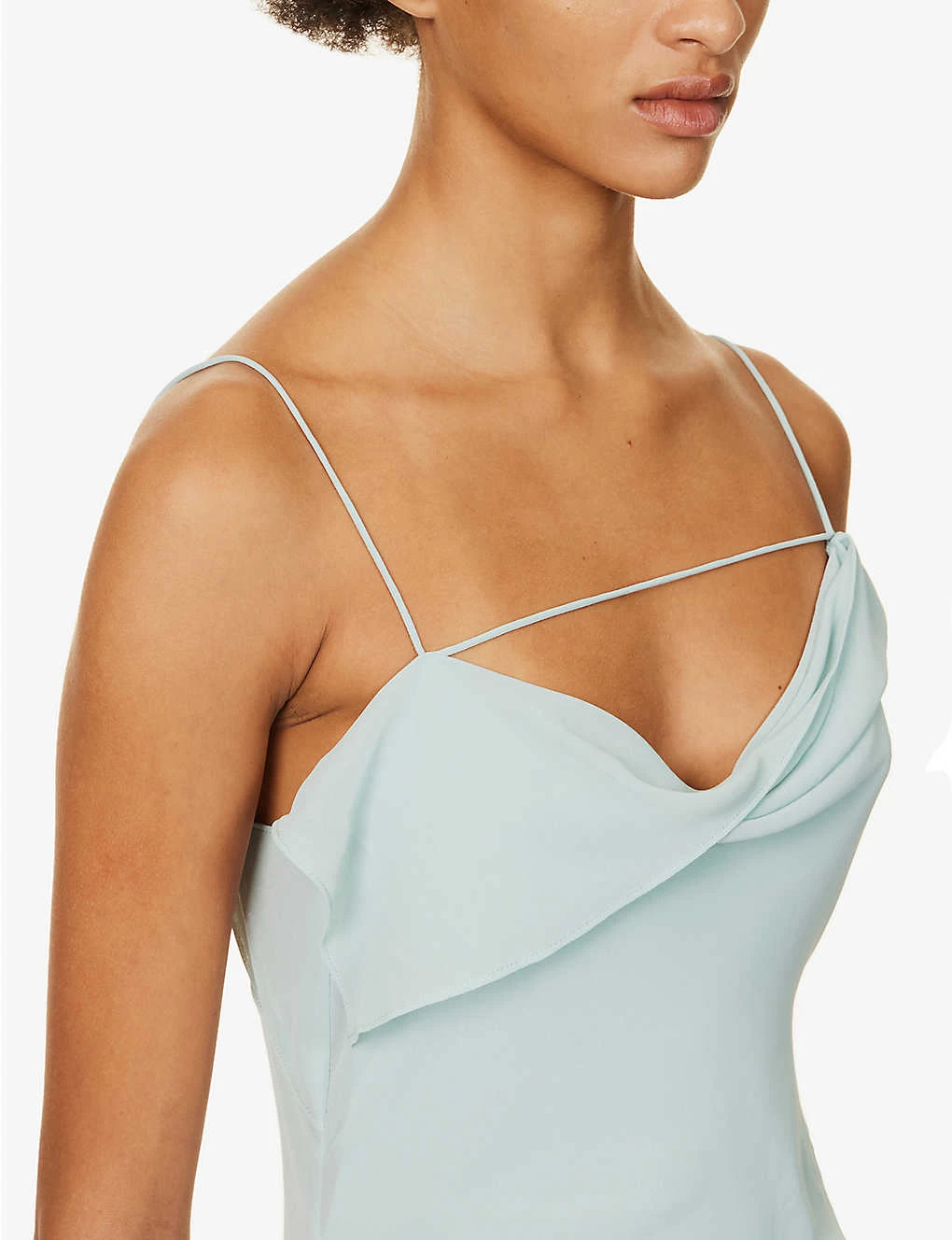 - Slim fit, cowl neck, shoulder straps, pleated at waist, semi-sheer, cut-out at back, split hem at front, asymmetric hem, fully lined