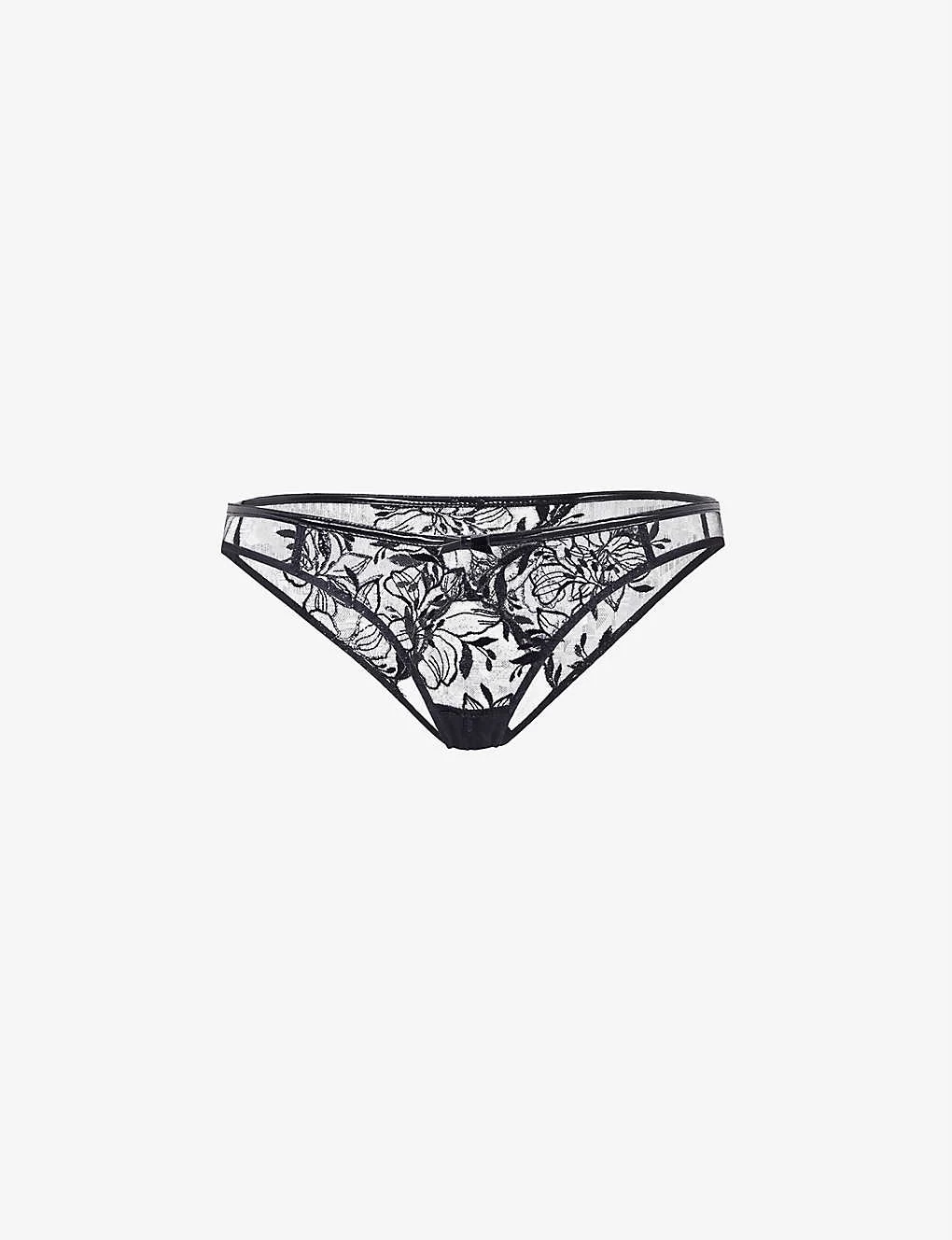 - Mid-rise, floral embroidered, open gusset, cutaway effect, ouvert style, wet look finish