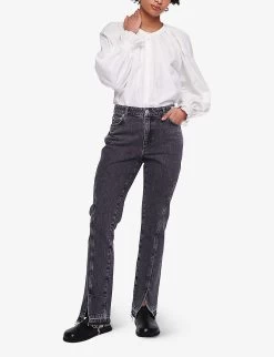 - Slim fit, high rise, straight leg, belt loops, five pockets, all-over faded wash, V-shaped yoke at back, distressed hem, branded silver-toned hardware
