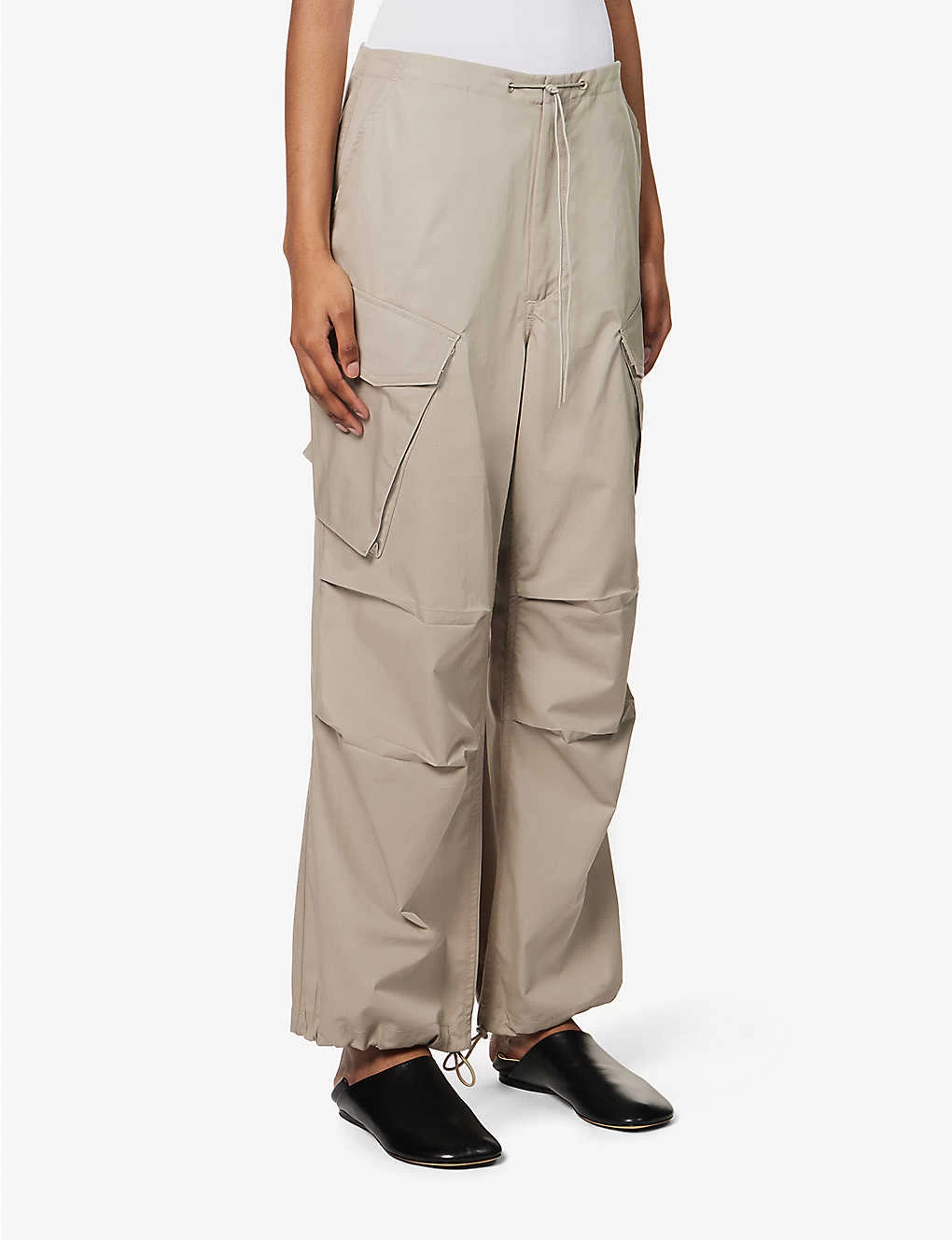 - Relaxed-fit, high-rise, wide leg, elasticated drawstring waistband, two slip pockets at front, buttoned flap pocket at back, exposed seams, drawstring hems