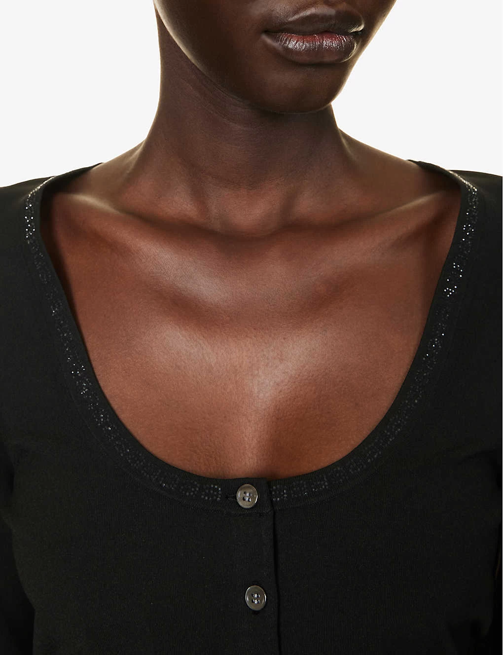 - Slim fit, scoop neckline, long sleeves, rhinestone trims with brand text, soft ribbed texture, pearlescent buttons, cropped