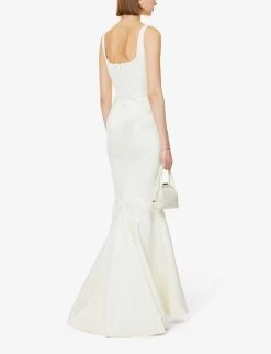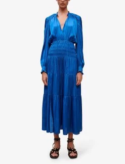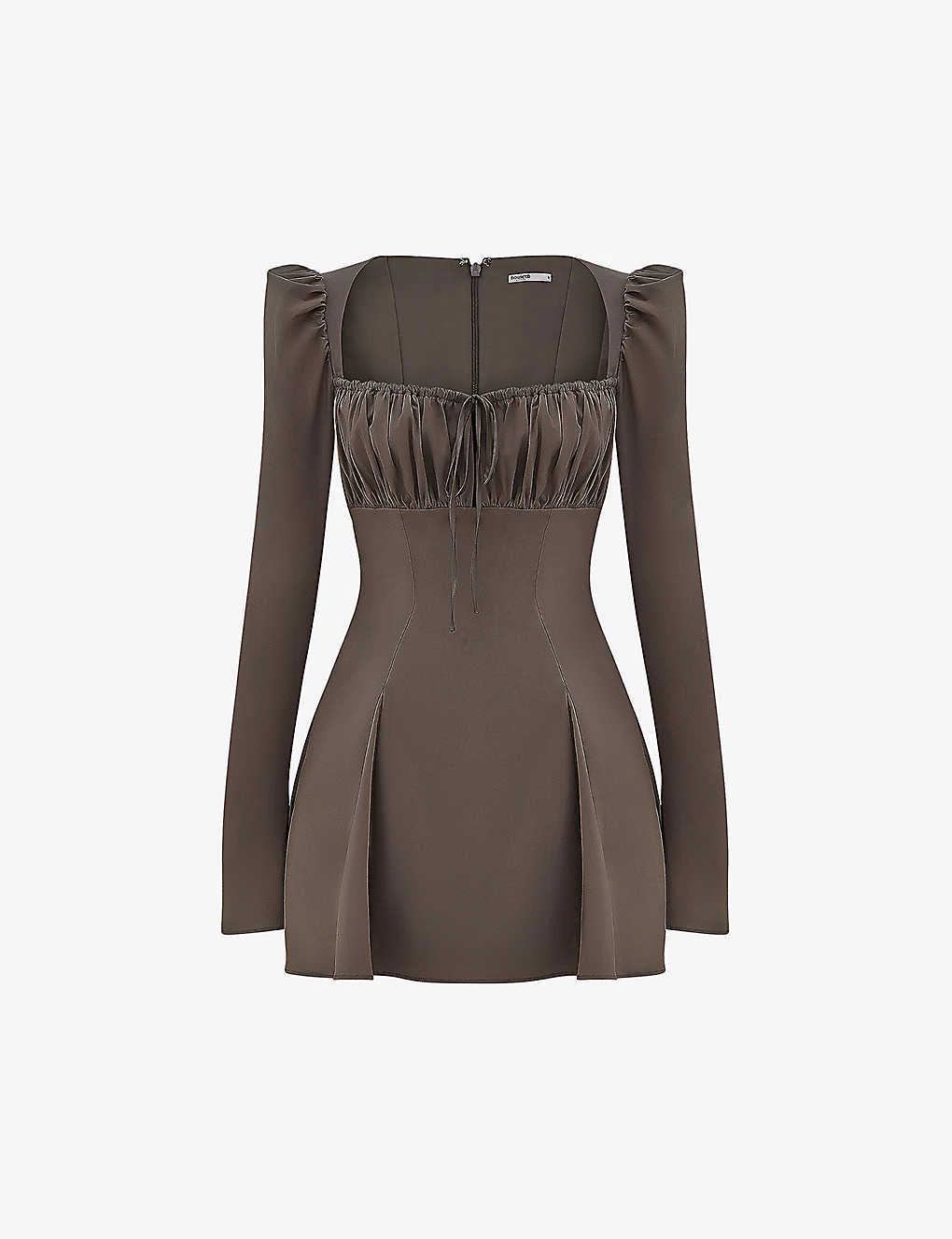 - Close fitting, gathered bust, square neckline, shrug shoulder, long sleeves, adjustable front ties, gathers on bust, godet panels on skirt, fully lined