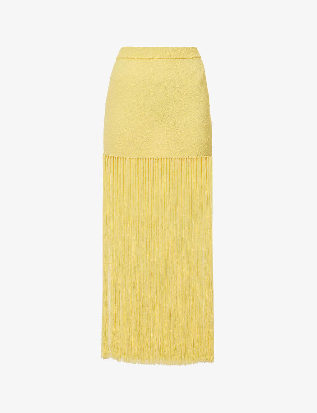 - Fitted, high waist, elasticated waistband, medium knit, all-over bouclé texture, tasselled fringe at hem
