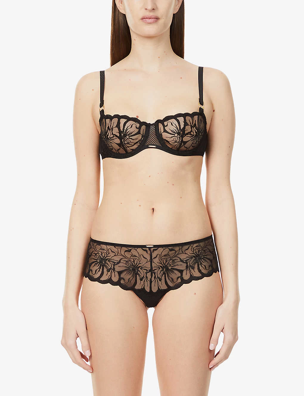 - Balconette silhouette, adjustable shoulder straps, all-over embroidered lace, underwired, scalloped trims