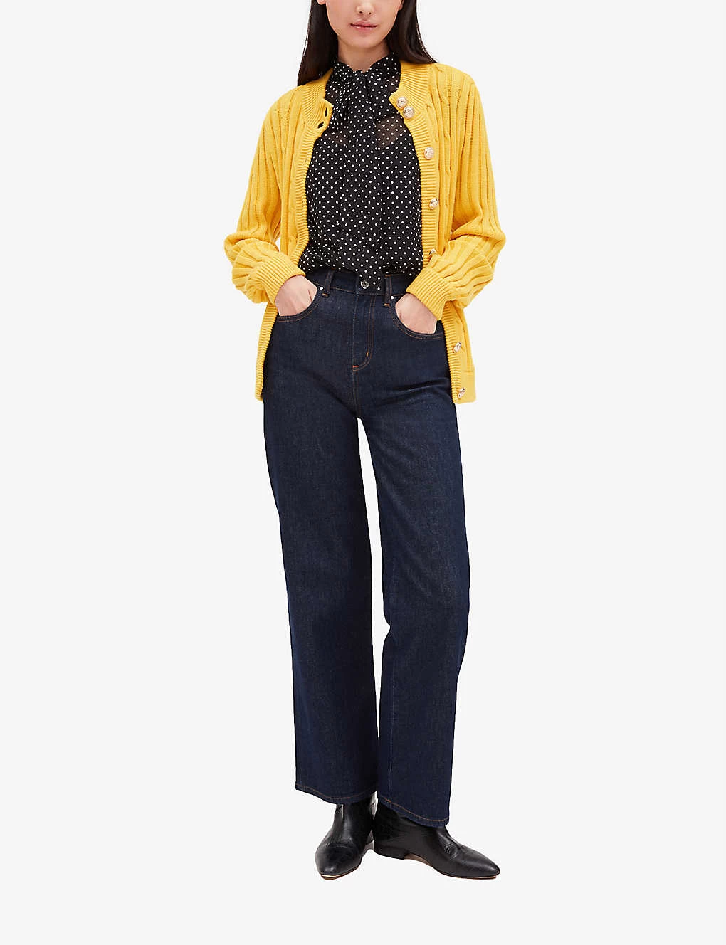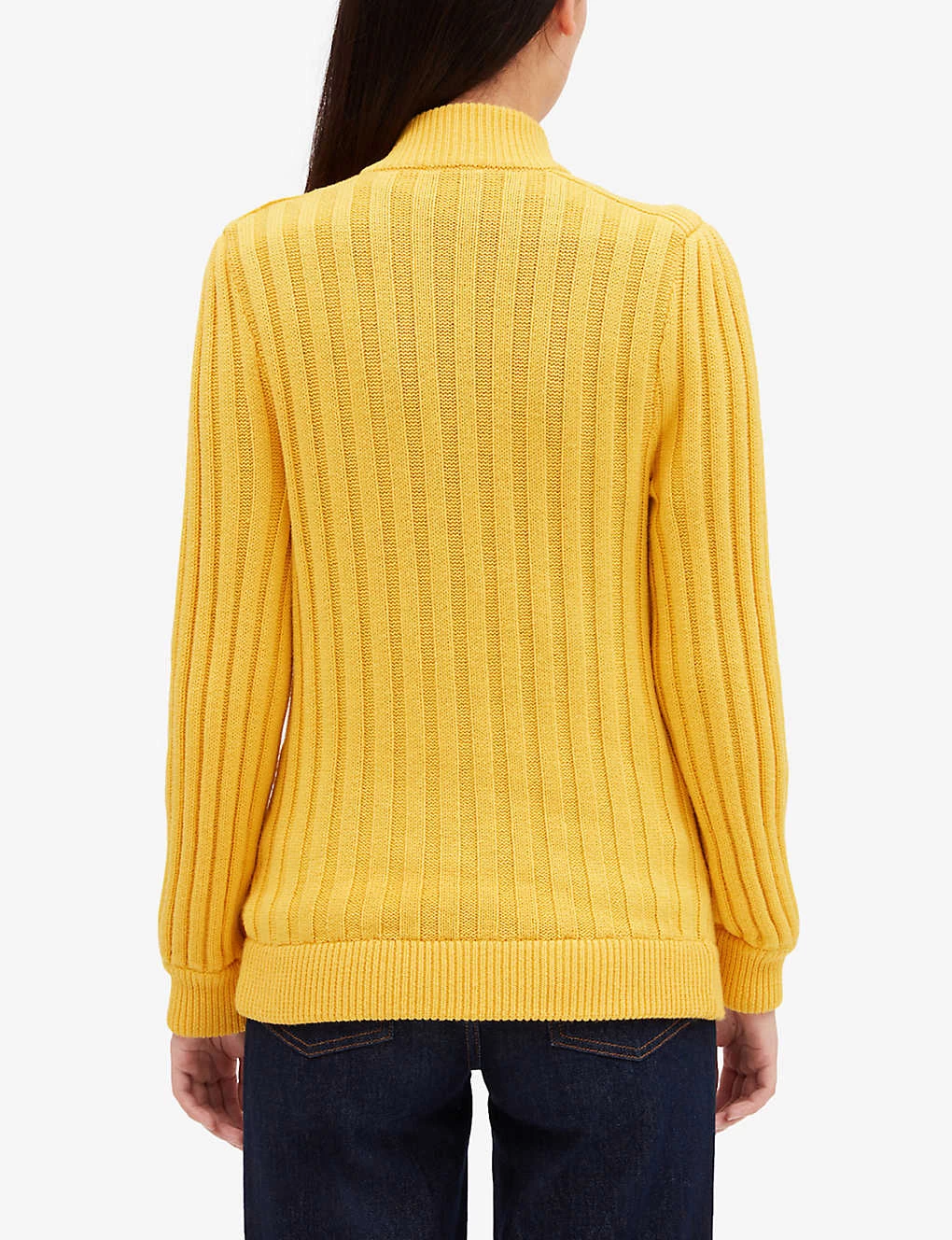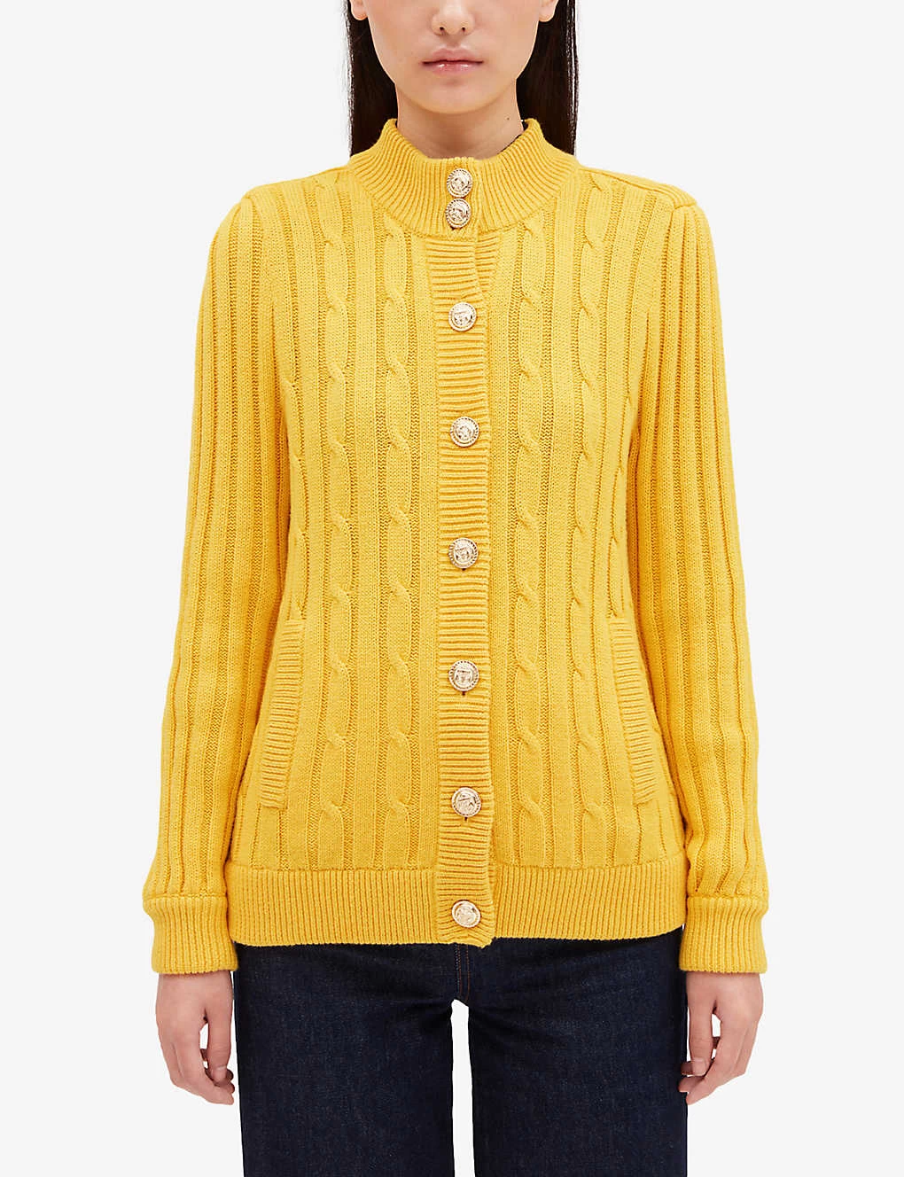 - High neck, long sleeves, all-over cable knit, officer buttons, gold-toned hardware, welt pockets at front, ribbed trims