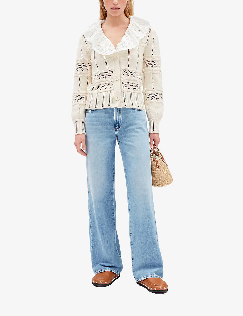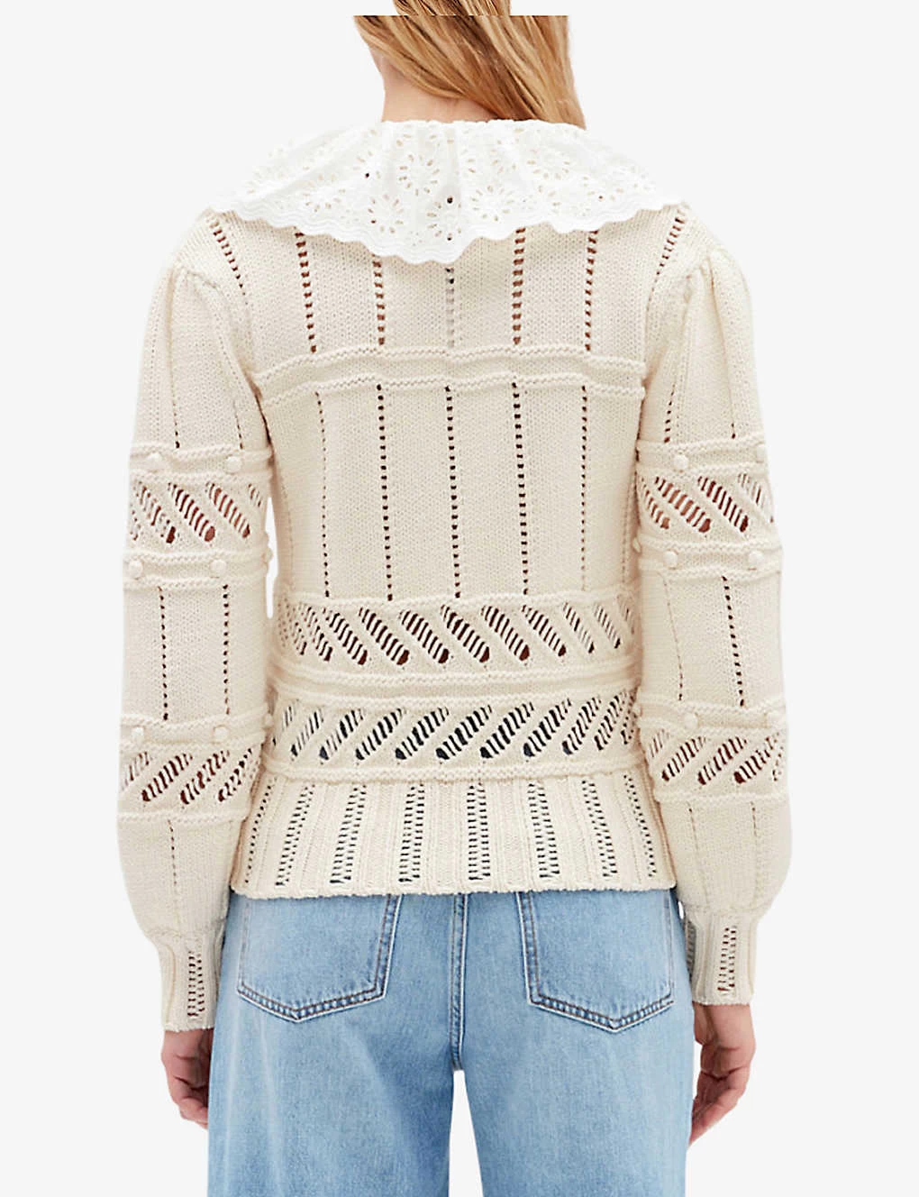 - Relaxed fit, V-neck, removable ruffled collar, long sleeves, all-over open work crochet panels, ribbed trims