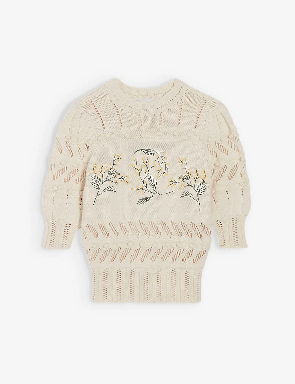 - Relaxed fit, round neck, three-quarter-length-sleeves, embroidered motifs at front, all-over open work crochet panels, ribbed trims
