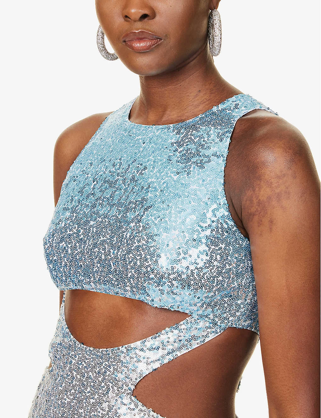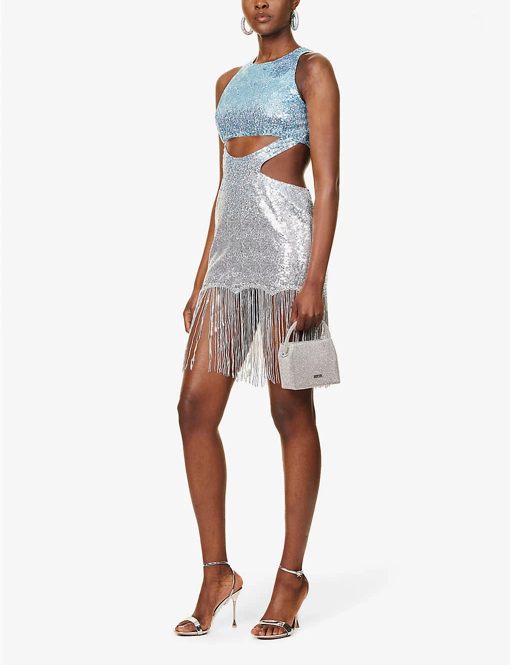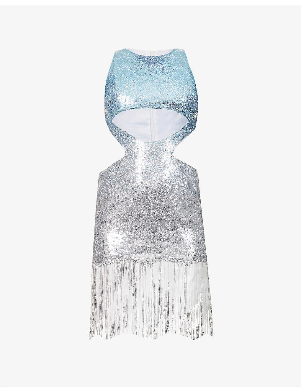 - Slim fit, round neck, sleeveless, cut-out at front and sides, all over sequin embellishment, all over graduated colour, fully lined, fringed edges