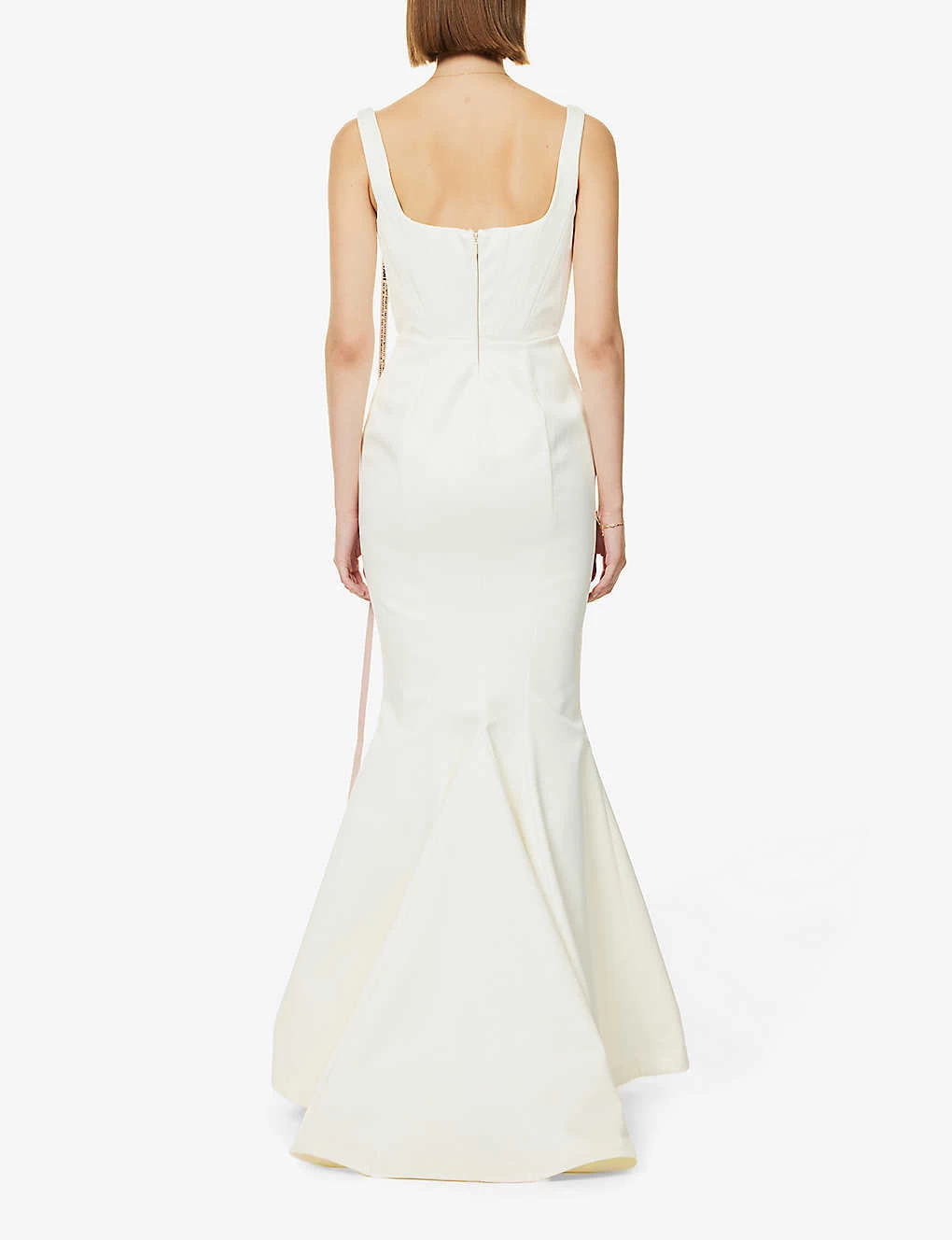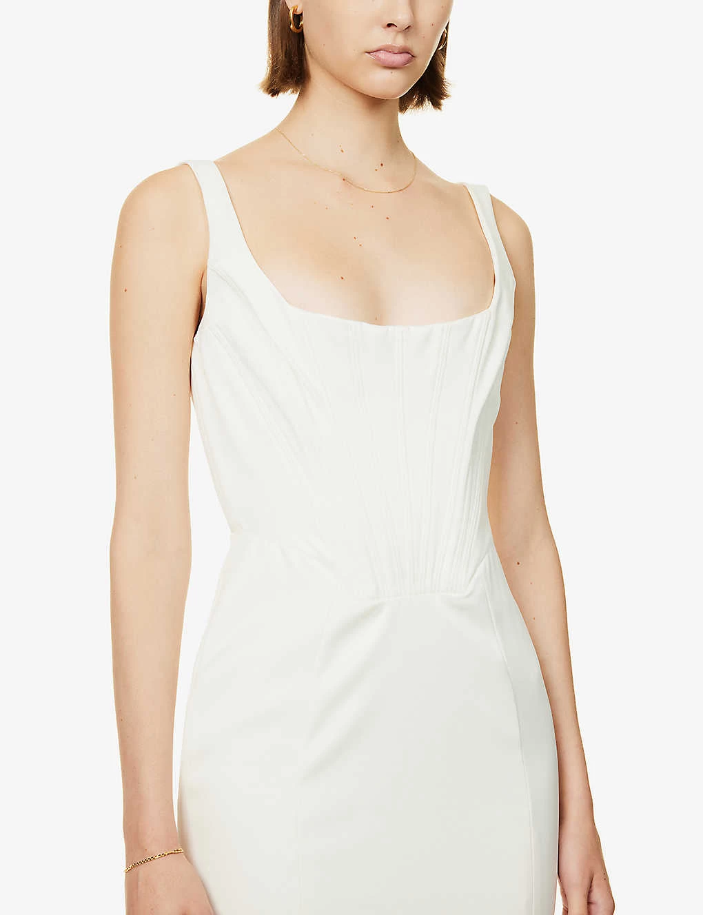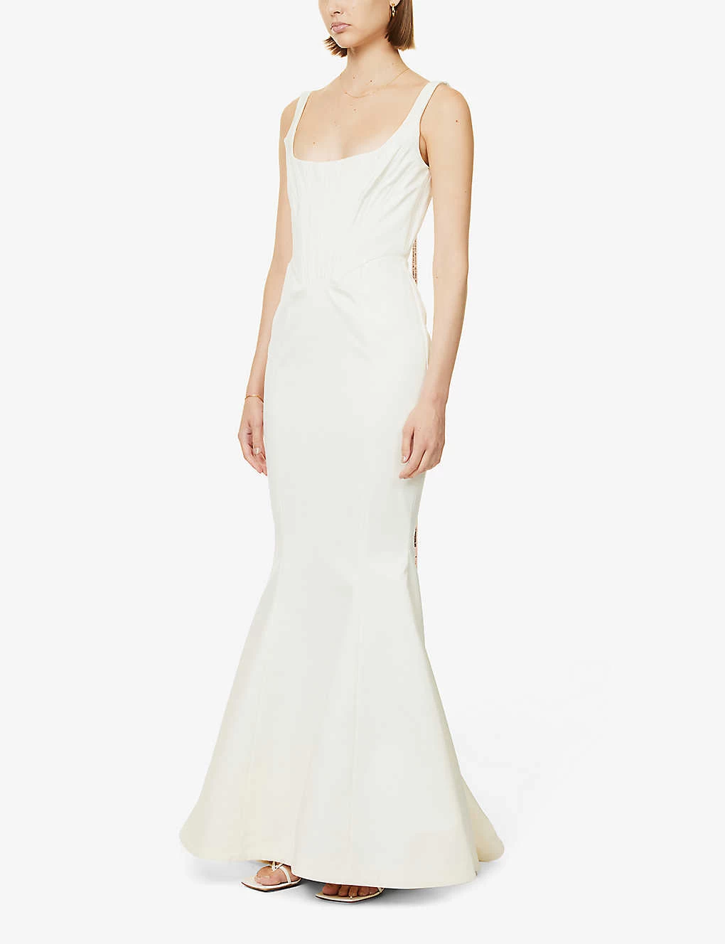 - Slim fit, scoop neck, sleeveless, corset bodice, loosed pleats at back, fully lined