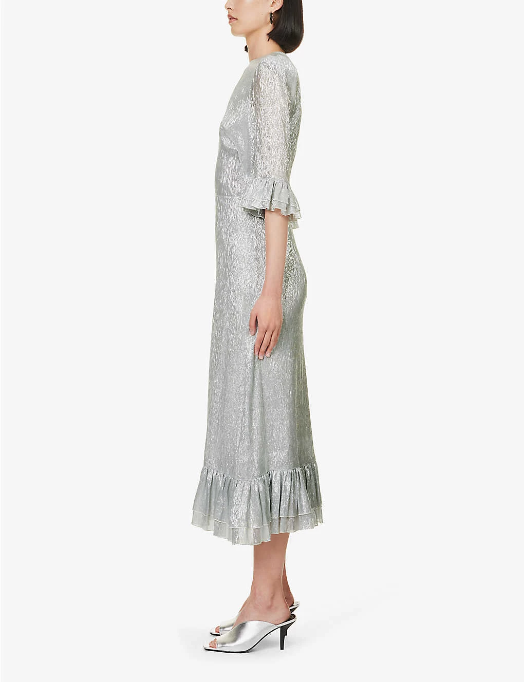 - Regular fit, round neckline, padded shoulders, three quarter sleeves, ruffle trim at sleeve hems, gathered at waist, all-over metallic thread weave, ruffle trim at hem