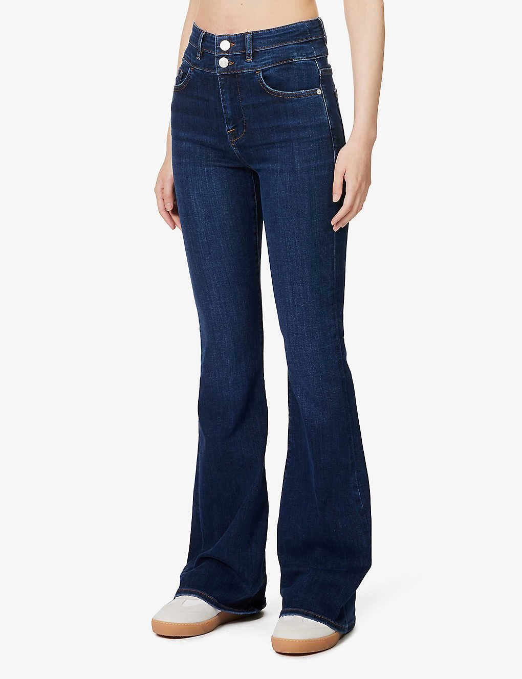 - Slim fit, high rise, flared leg, double waistband with belt loops, five pockets, mid-wash, contrast stitching, branded silver-toned hardware
