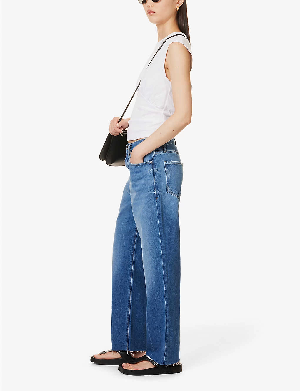 - Regular-fit, high-rise, straight leg, belt loops, branded silver-toned hardware, five pockets, all-over faded wash and whiskering, cropped, partially lined, raw hems
