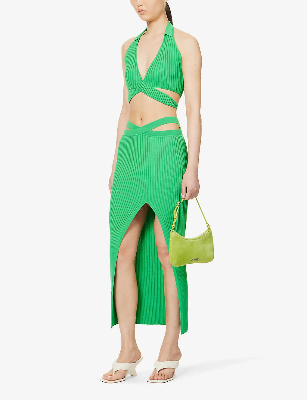 - Fitted, collar, sleeveless, plunge neckline, all-over knitted texture