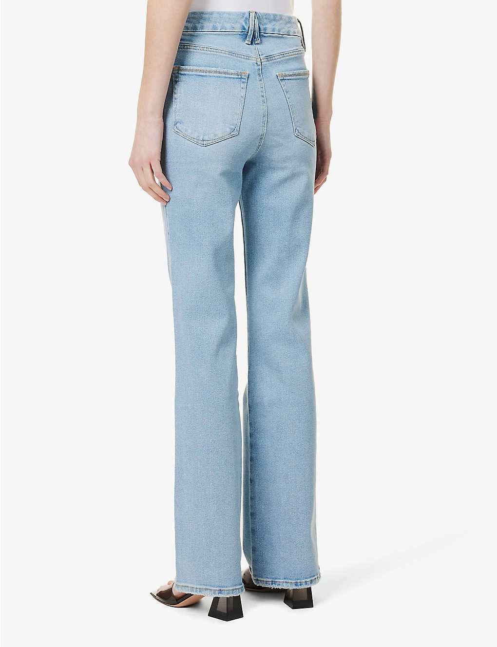 - Regular fit, mid-rise, flared leg, structured waistband with belt loops, five pockets, curved yoke at back, contrast stitching, silver-toned hardware