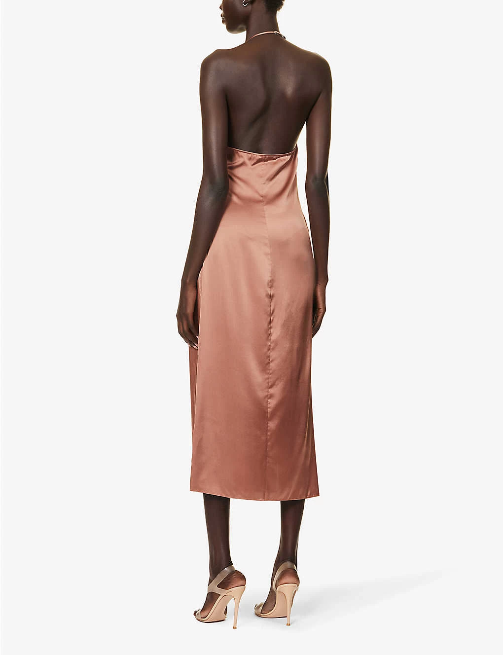 - Slim fit, halterneck, sleeveless, open back, draped design, split hem