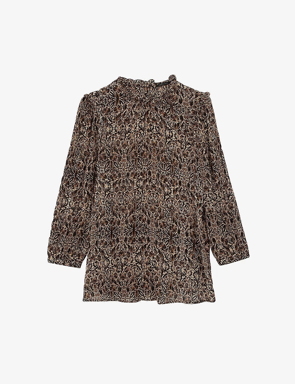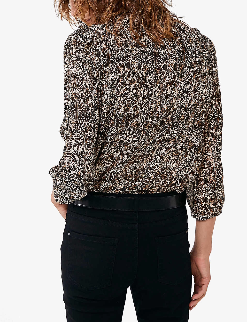 - Loose fit, high neck, ruffles at shoulder, long sleeves, button cuffs, all-over arabesque-print, button fastening at back