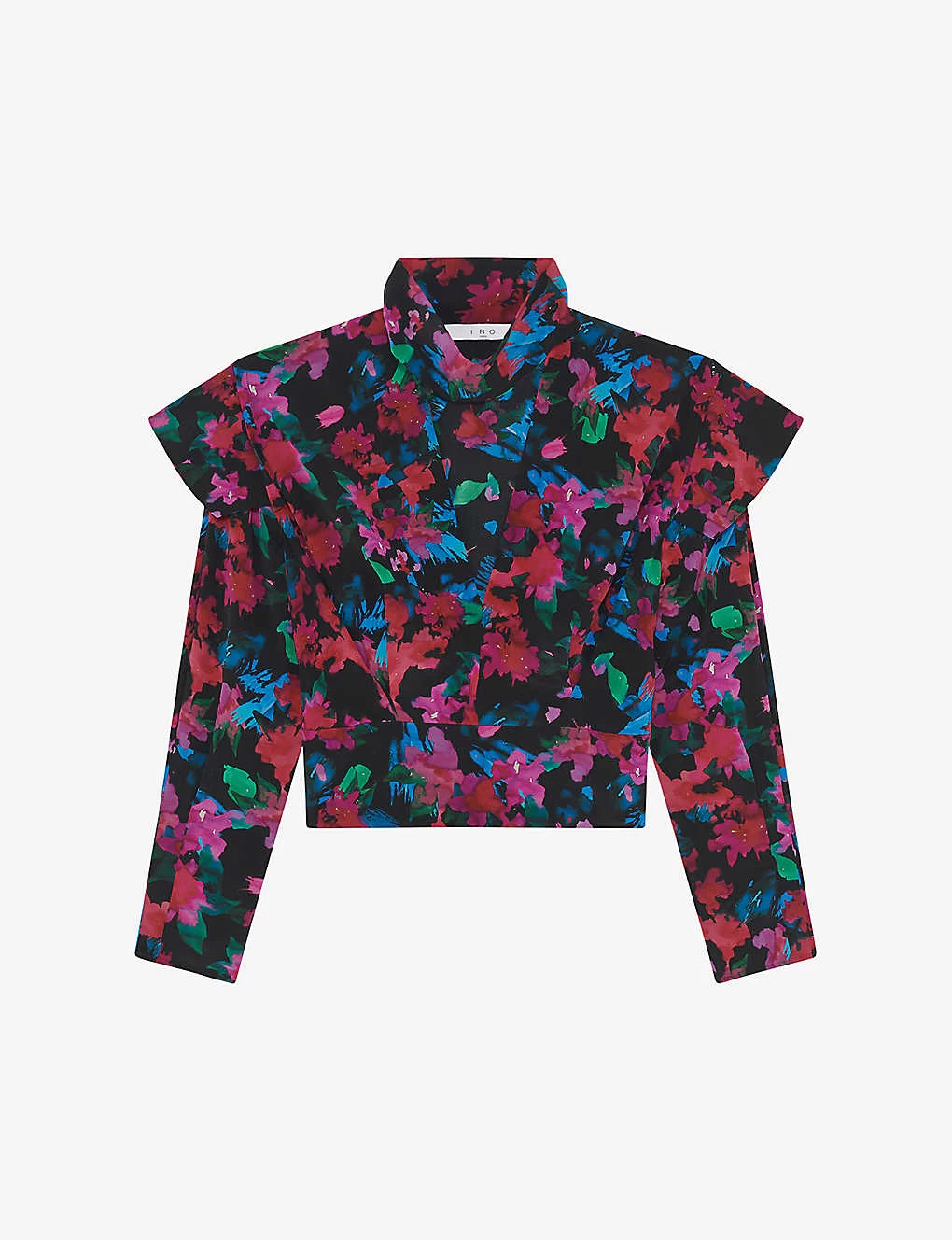 - High neck, cut-out detail at chest, ruffle overlay on shoulder, long sleeves, all-over floral print, straight hem