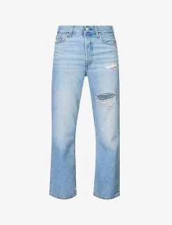 - Relaxed fit, high-rise, straight leg, belt loops, five pockets, brand patch and brand tab at back, faded wash and whiskering, distressed and cut-out at front, straight cuffs