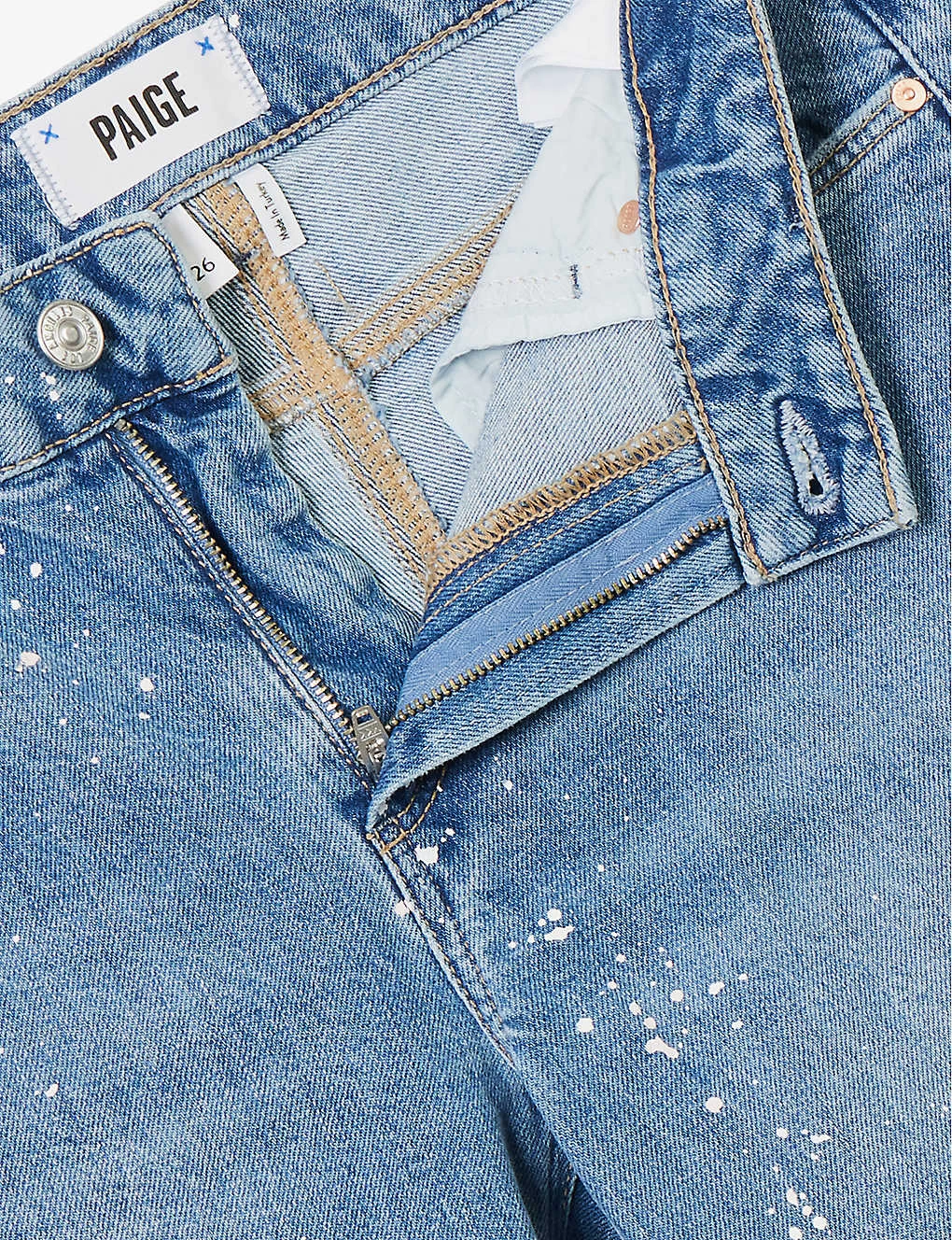 - Regular fit, mid-rise, straight leg, structured waistband with belt loops, five pockets, curved yoke at back, brand patch at back, mid-faded wash, contrast stitching, paint splatter design, branded silver-toned hardware, raw hems
