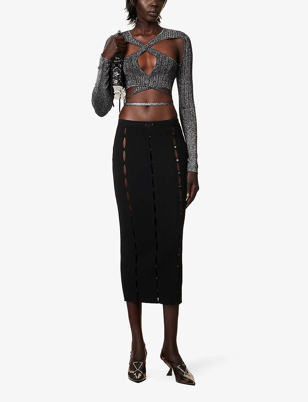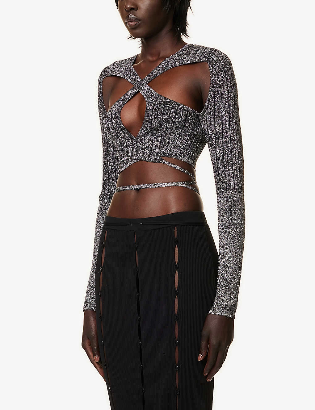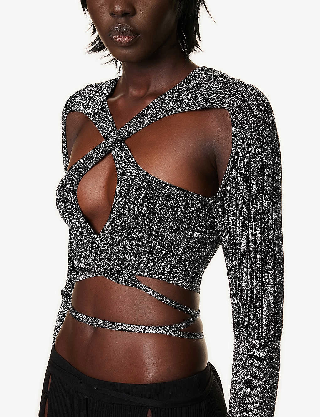 - Slim fit, V-neckline, long sleeves, cut-out panels at front, ribbed knit texture, metallic thread weave, wrap-over self-ties at hem, cropped