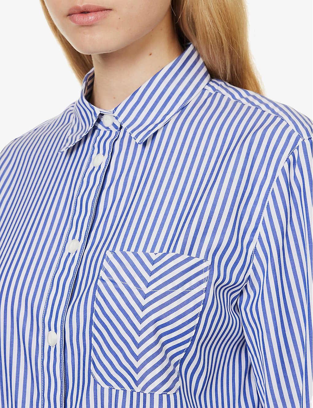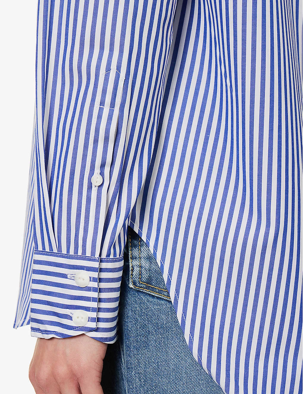 - Relaxed fit, collar, long sleeves, buttoned sleeve hems, patch pocket at chest, all-over stripe pattern, curved hem