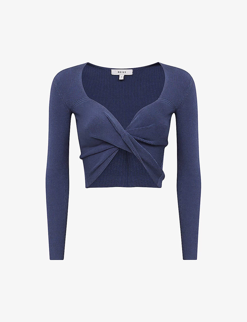 - Fitted, sweetheart neckline, long sleeves, twisted front detail, all-over rib fabrication, cropped hem design