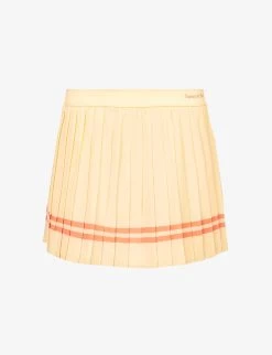 - Mid-waist, elasticated branded waistband, all-over knife pleats, striped pattern at hem, shorts underlay
