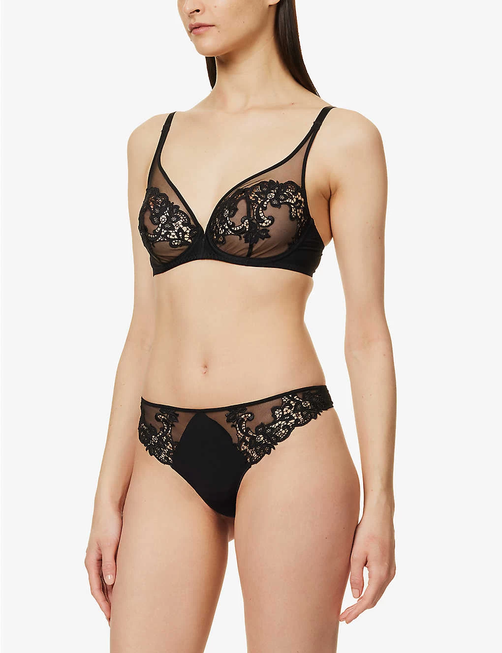 - Plunge half-cup, underwired, non-padded cups, adjustable straps, floral embroidered appliqué pattern, semi-sheer cups, full support