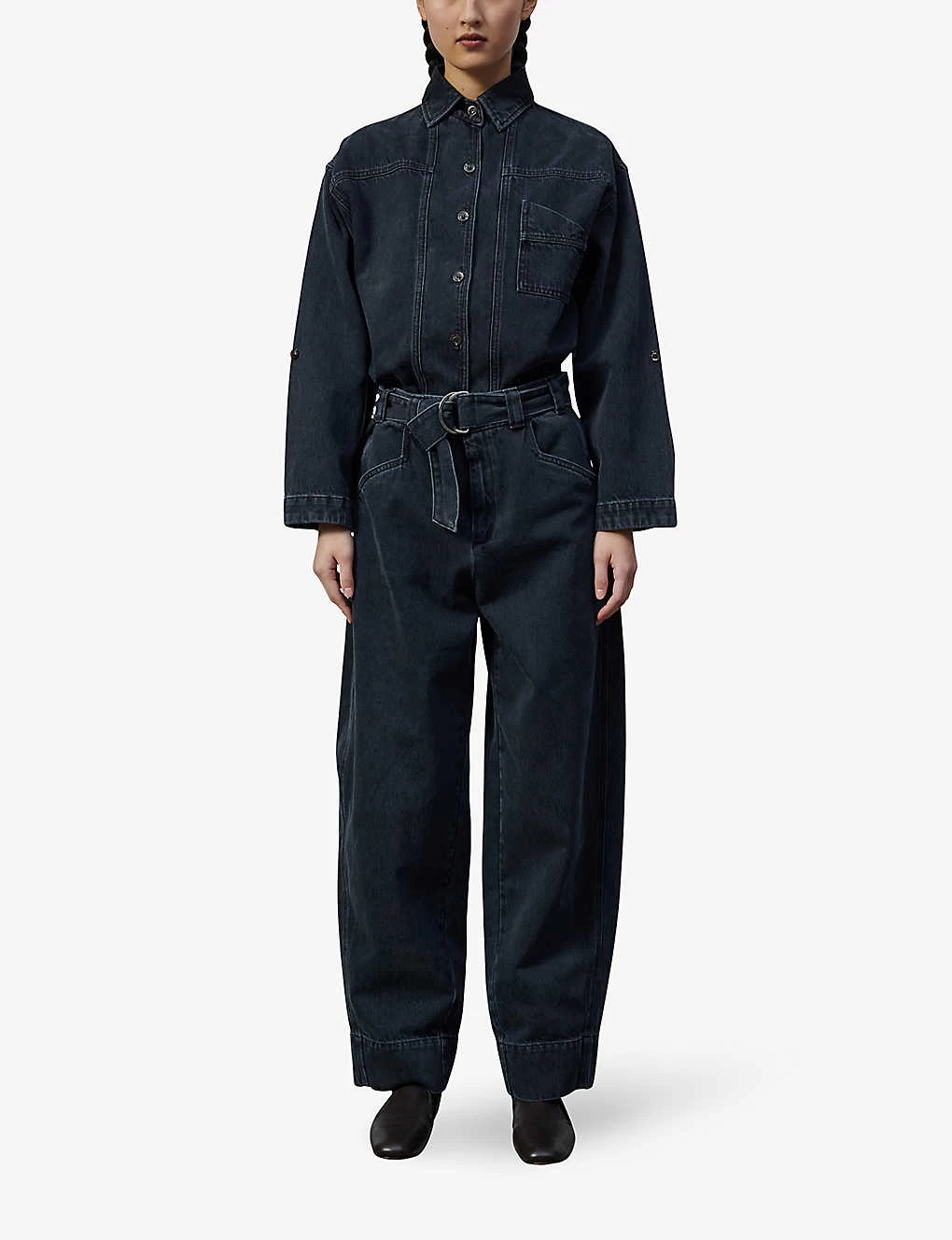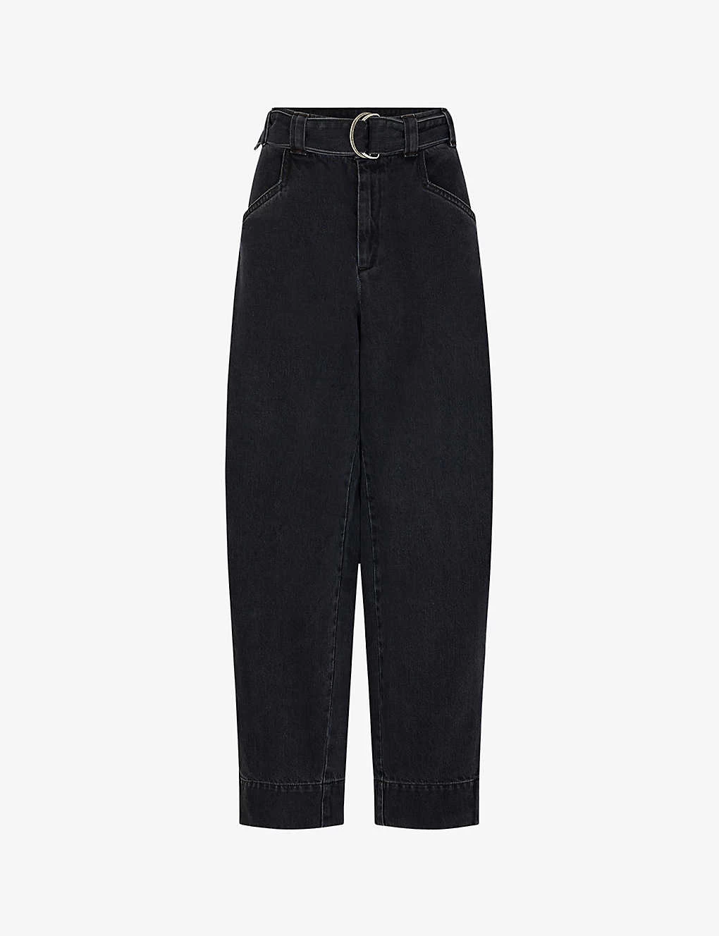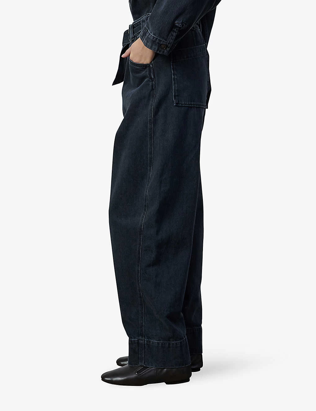 - Relaxed fit, high rise, tapered leg, detachable belt, belt loops, mid wash, two angled patch pockets, fully lined