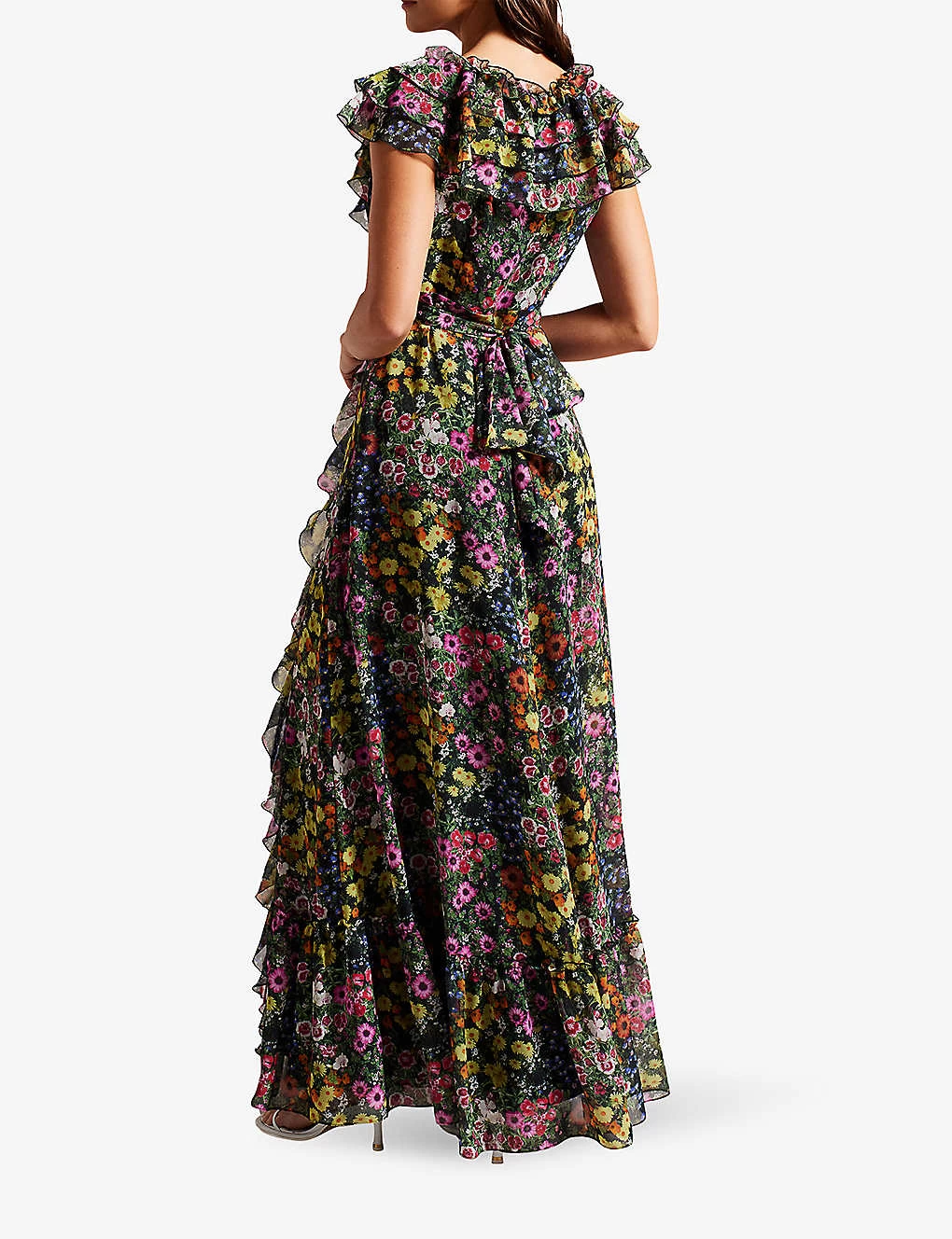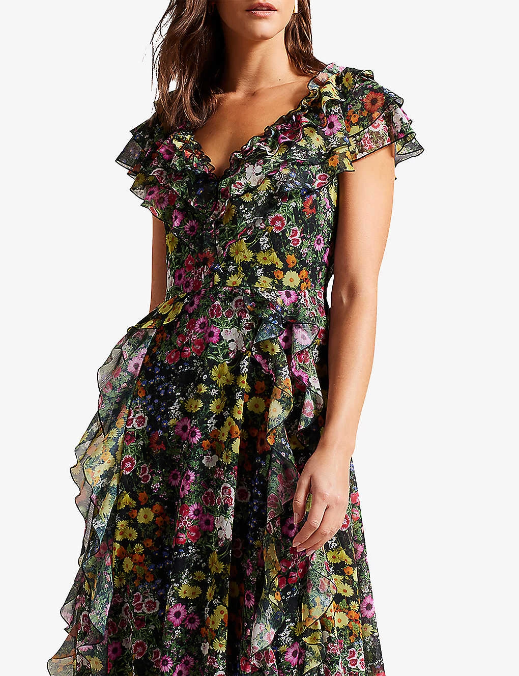 - Ruffled trim V-neck, short ruffled sleeves, ribbon-tie waistband, waterfall ruffled trims at front, A-line hem, fully lined, all-over floral print