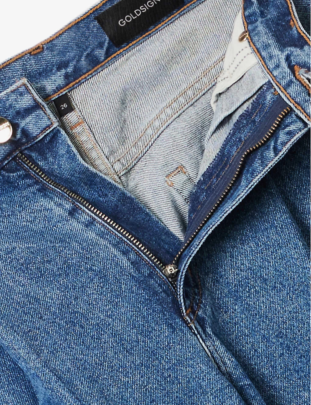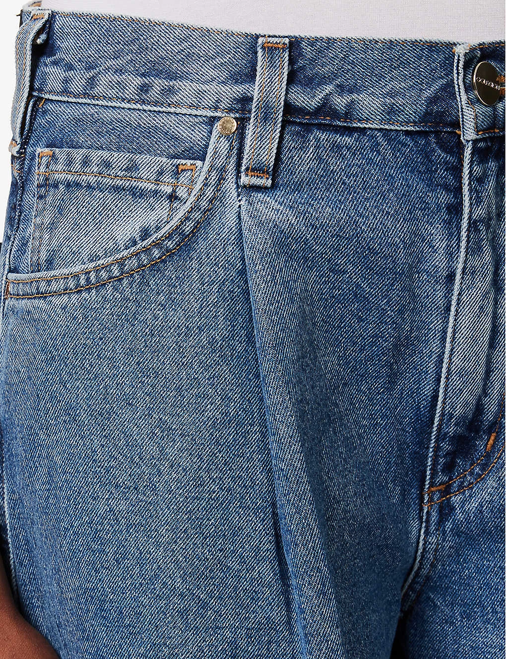 - Regular-fit, high-rise, wide leg, belt loops, pressed pleats at front, branded silver-toned hardware, all-over faded wash, contrast stitching, debossed brand patch at back, V-shaped yoke at back, partially lined