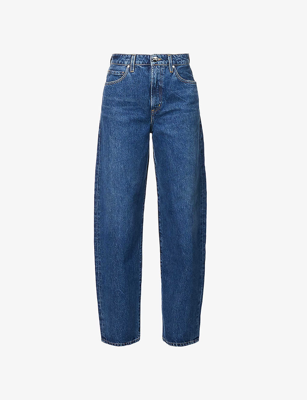 - Regular-fit, high-rise, wide leg, belt loops, five pockets, all-over faded wash and whiskering, contrast stitching, debossed brand patch at back, V-shaped yoke at back, partially lined