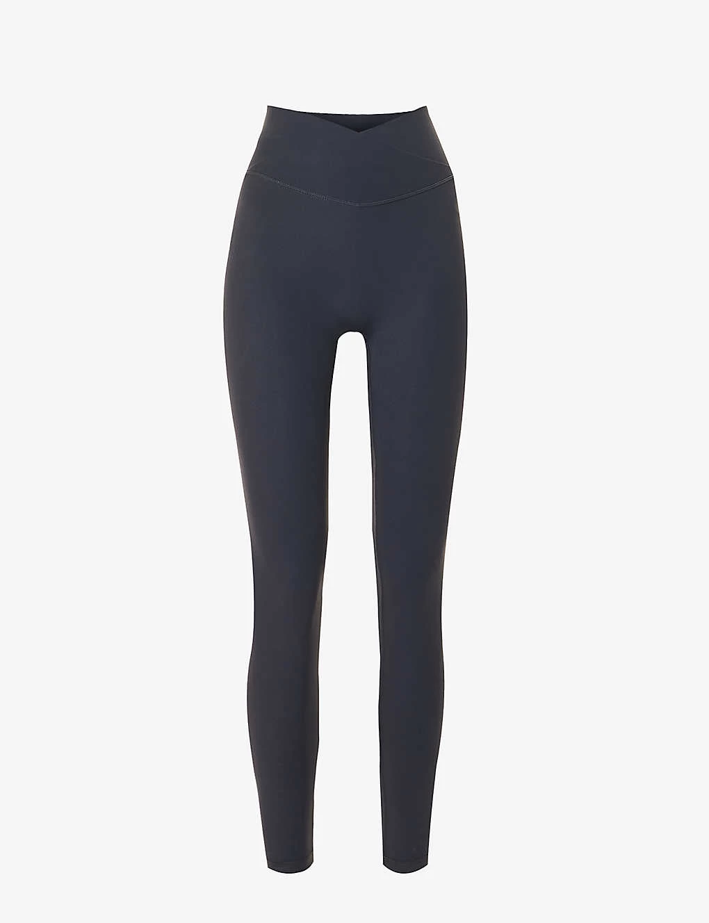 - Fitted, high rise, crossover dipped waist at front, brand print at back, exposed seams