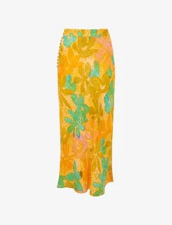 - High rise, zip fastening at the side, button-embellishment at the side, palm-floral print throughout, A-line shape, midi length